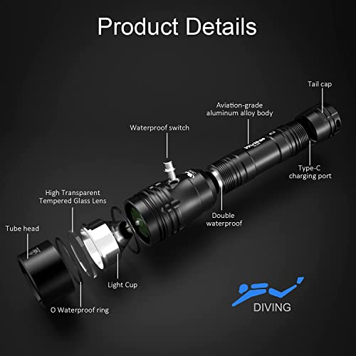 Betrouwbare kwaliteit: professionele duikzaklamp, gemaakt van hoogwaardige aluminiumlegering, bestand tegen slijtage en zeewater. Thermo-elektrisch scheidt het koperen substraat en voert de door de led geproduceerde warmte snel af. Opmerking: was na elke duik met vers water, vooral in de buurt van de schakelaar. Zorg ervoor dat de duiklamp volledig droog is voordat je hem opbergt, om corrosie door zeewater te voorkomen.