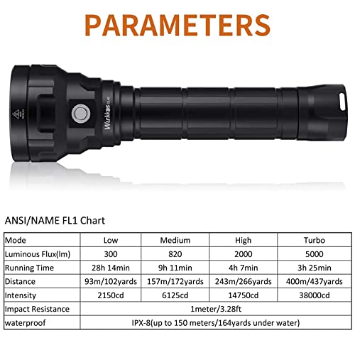 Specification: Wurkkos Duiklamp, duiklamp, 5000 lumen, oplaadbaar, waterdicht IPX8, professionele duiklamp, 4 x Samsung LH351D led met 2 x 26650 batterijen en oplader
