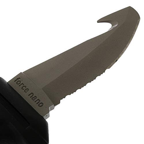 Het mes “Force Nano +” is bedoeld om het aan Mares-jassen te bevestigen, waarbij de bevestigingsset al in de levering is inbegrepen. Je kunt het ook aan benen, armen, riemen en aan de opblader bevestigen. Een aangename, veilige hantering is door de ergonomisch gevormde handgreep gegarandeerd. Als veiligheidseigenschappen heeft het mes een linnencutter op de achterkant van het mes en het lemmet is veredeld tegen corrosie.