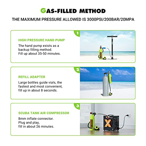 đăBREDE COMPATIBILITEITă:U kunt op elk moment een handpomp gebruiken om de duikfles op te blazen. (Gewoonlijk vullen in ongeveer 15-30 minuten.) Tegelijkertijd kunt u de SMACO-navuladapter gebruiken, grote flesjes, dit is de snelste en handigste methode, meestal het vullen van een 1 liter duiktank in 8 seconden. als je thuis een elektrische luchtpomp hebt, heb je meer tijd en geld over.