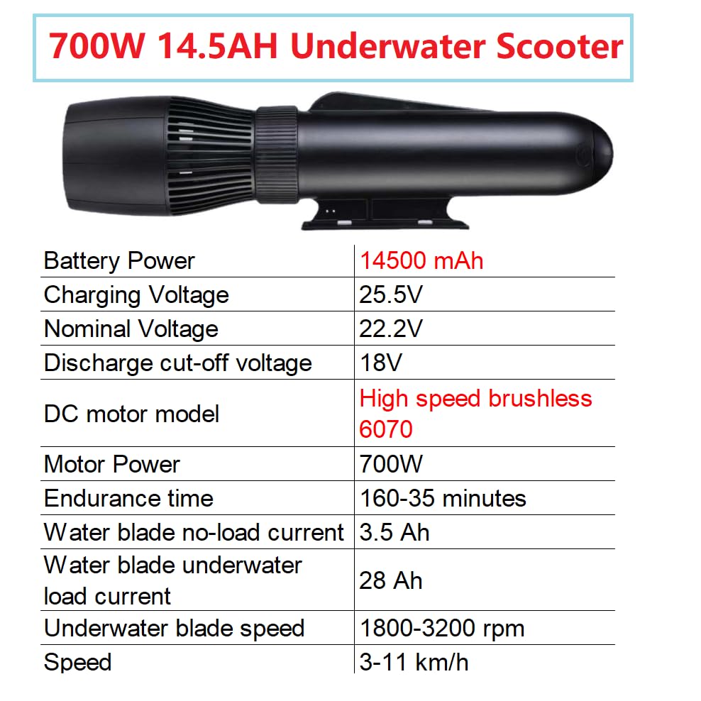 Specification: Elektrische 700 W Jetski 3m/s Onderwater Zee Scooter, 14500mAh 160mins Water Scooter, Borstelloze Motor Onderwater Boegschroef voor Zwembad Zee (Standaard+Handvat)